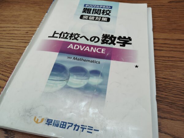 早稲アカ生は、中3夏〜2学期にかけて、上位校への数学ADVANCEをやり込むようですが、ウチの息子は8月の時点で着手するのは時期尚早と判断し、2学期から(塾で三平方の定理の単元をしっかり習ってから)やる予定です。