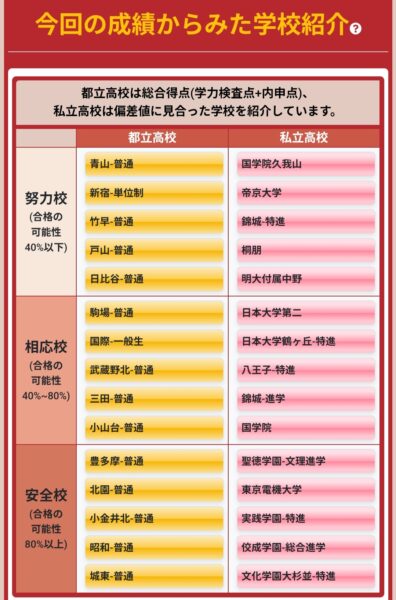 2学期の仮内申(素内申35以上40未満)が反映されたあとの学校紹介はこんなかんじのラインナップに変化していました↓ 私立志望だったので、Vもぎのおすすめ私立高校や私立の合格可能性判定は無視して、駿台模試の合格判定のほうを参考にしていました。