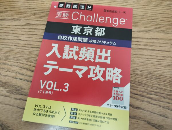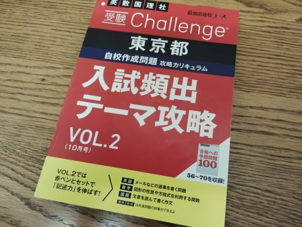 中3進研ゼミ中学講座ハイブリッドスタイル(最難関挑戦コース)で9月号から毎月1冊ずつ届いている「入試頻出テーマ攻略 東京都 自校作成問題 攻略 カリキュラム」。解説が詳しくて、息子にはレベル感も合ってよさげです。数学は定期テスト対策と入試対策をいっぺんにやってもらいましょう。期末テストまでの3週間で少なくとも3周はしてもらいたいところです。