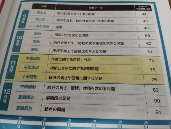 特に数学は、期末テストの範囲になるであろう「相似」含め、入試頻出単元の図形が基本・標準レベルから定着していなくて、(母は)危機感を抱いています。期末テスト2週間前からやったのでは絶対間に合わない。4週間前から取り組もう!!